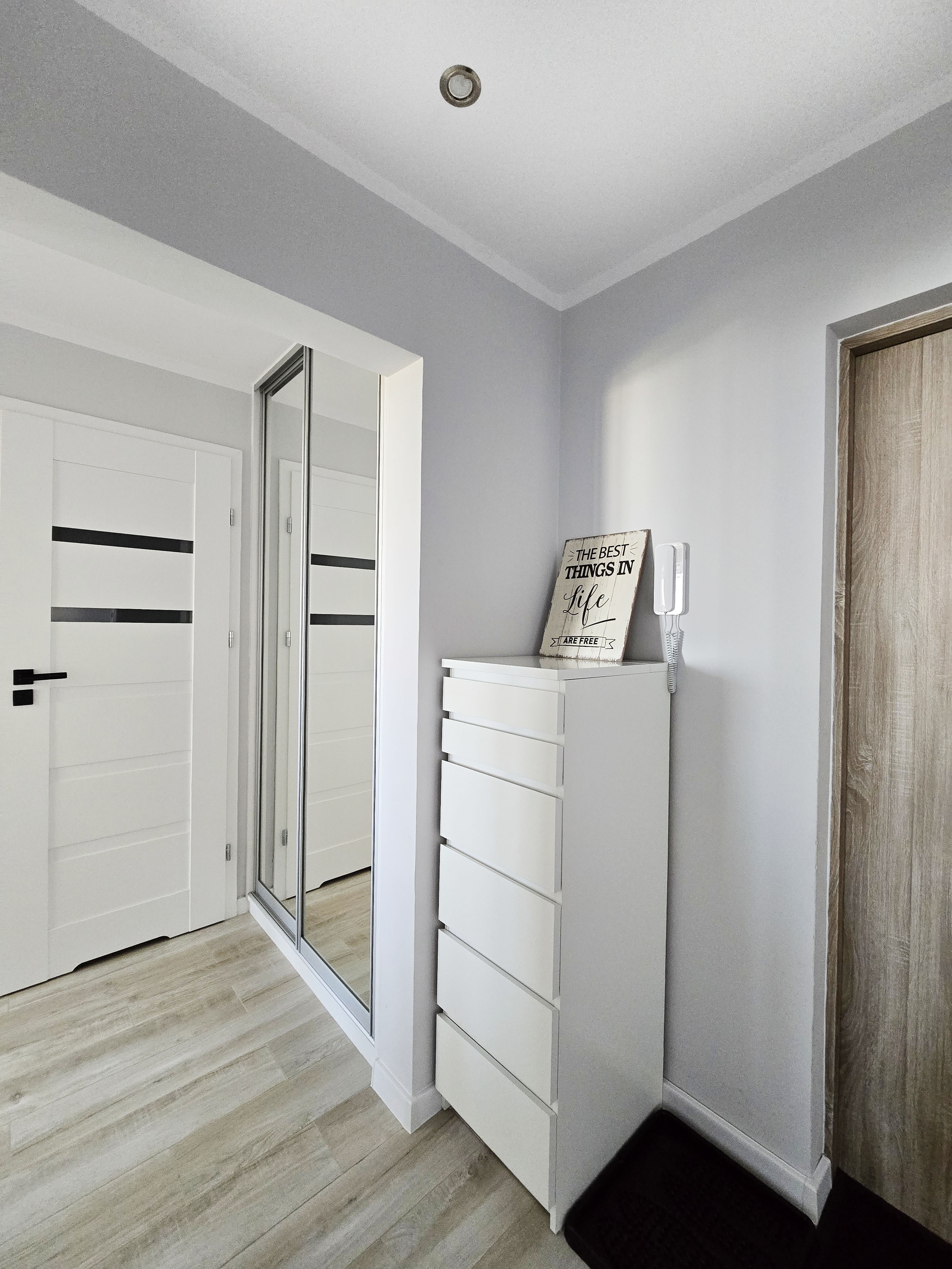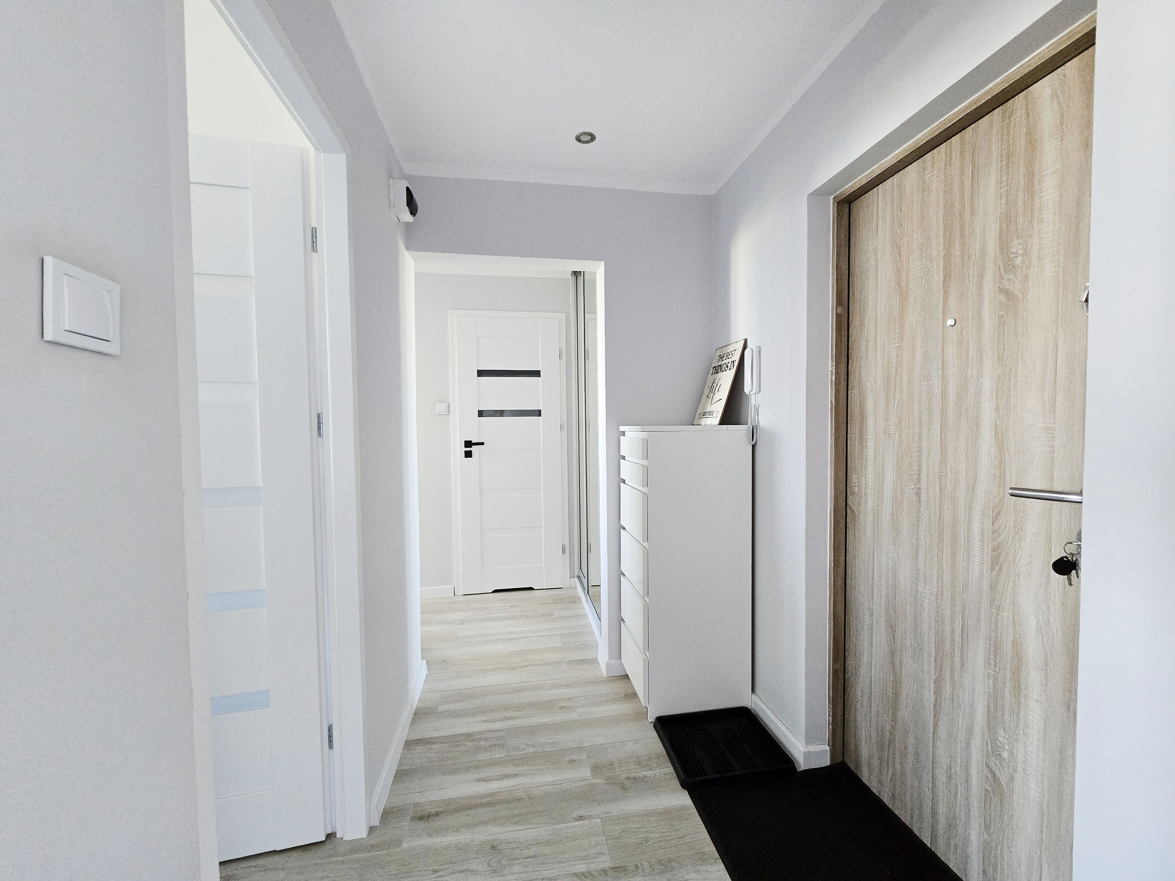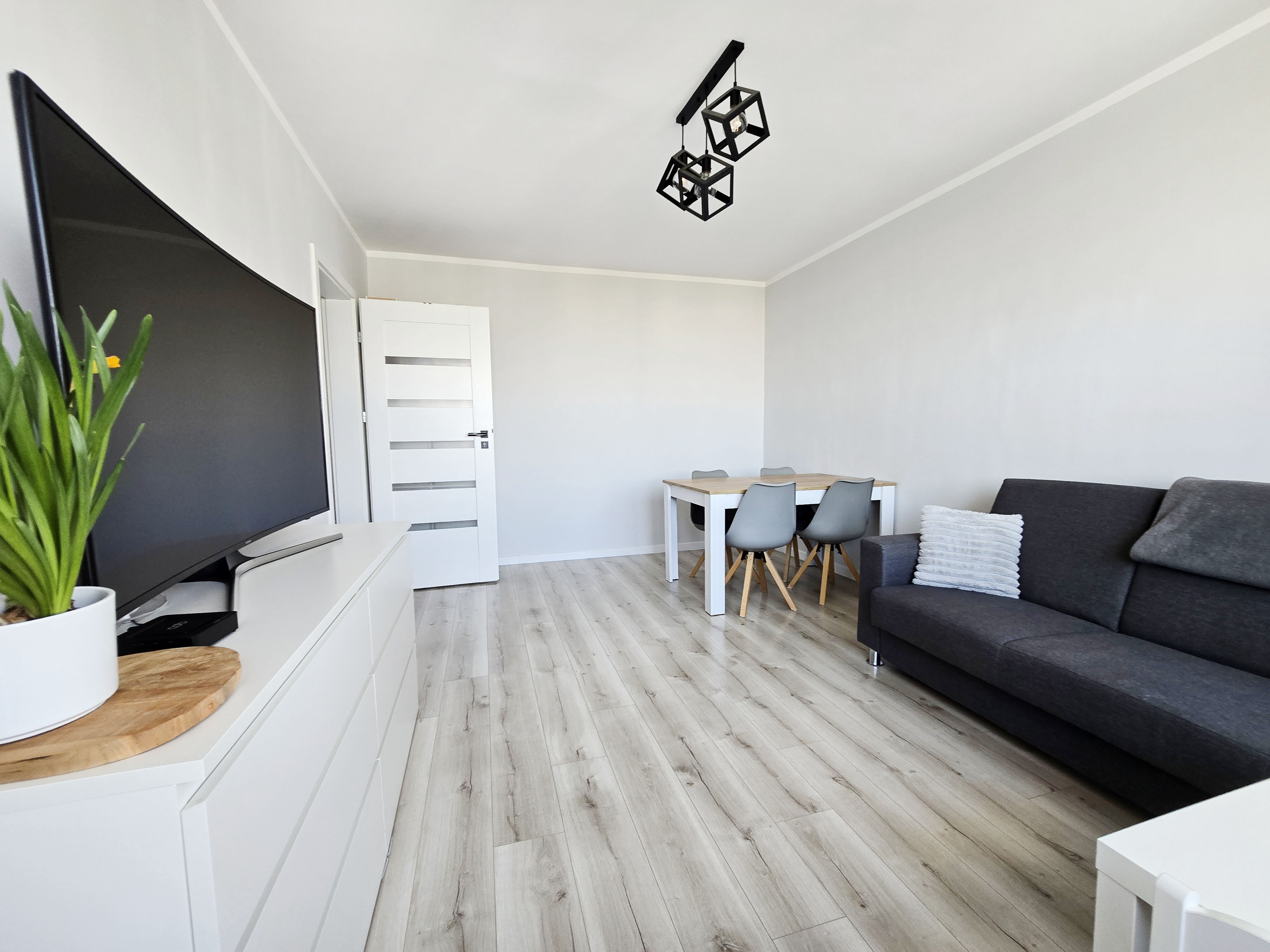 Mieszkanie jest funkcjonalne, z wyraźnym podziałem na część dzienną i prywatną.