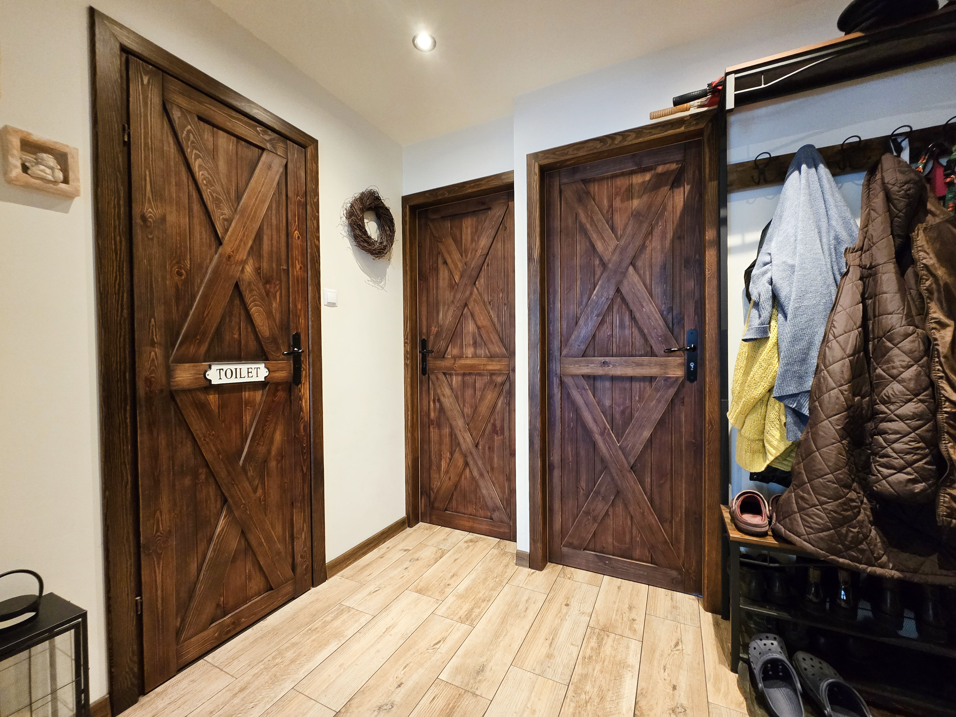 - Korytarz - 3,6 m² - w którym znajdują się piękne, ręcznie wykonane drewniane drzwi prowadzące do pomieszczeń.
