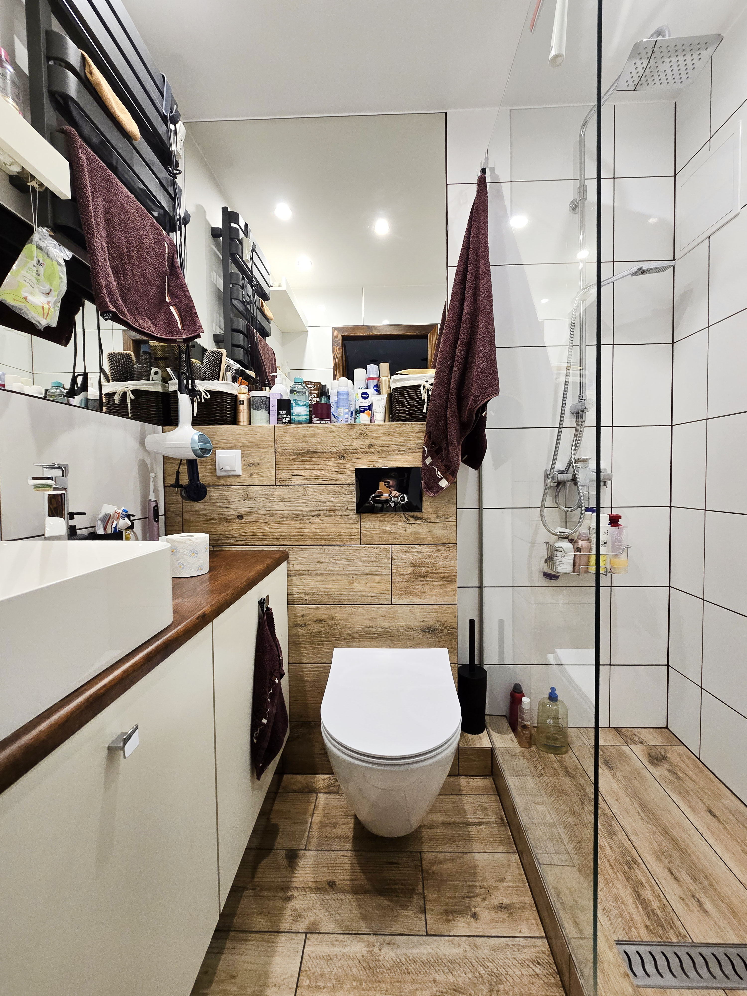 Stylowa łazienka z dużym prysznicem i funkcjonalnym zagospodarowaniem;