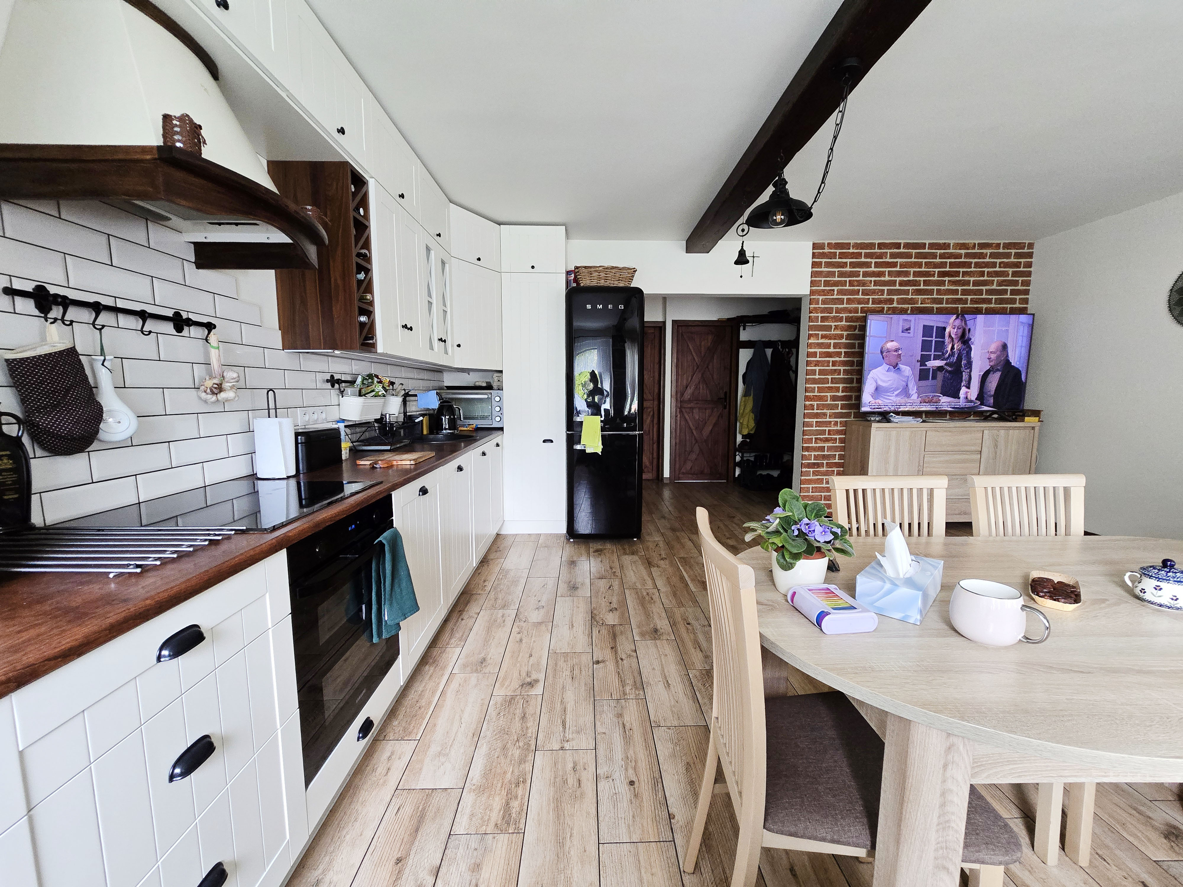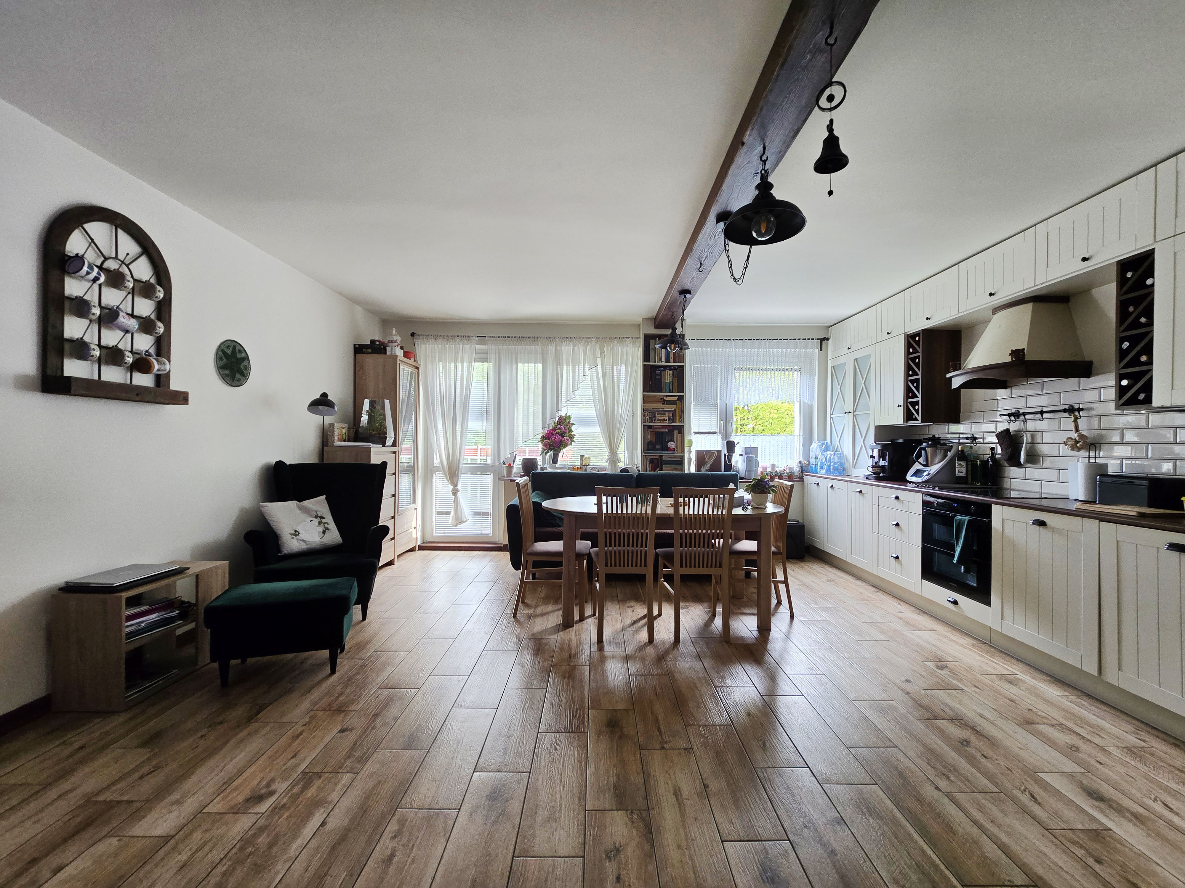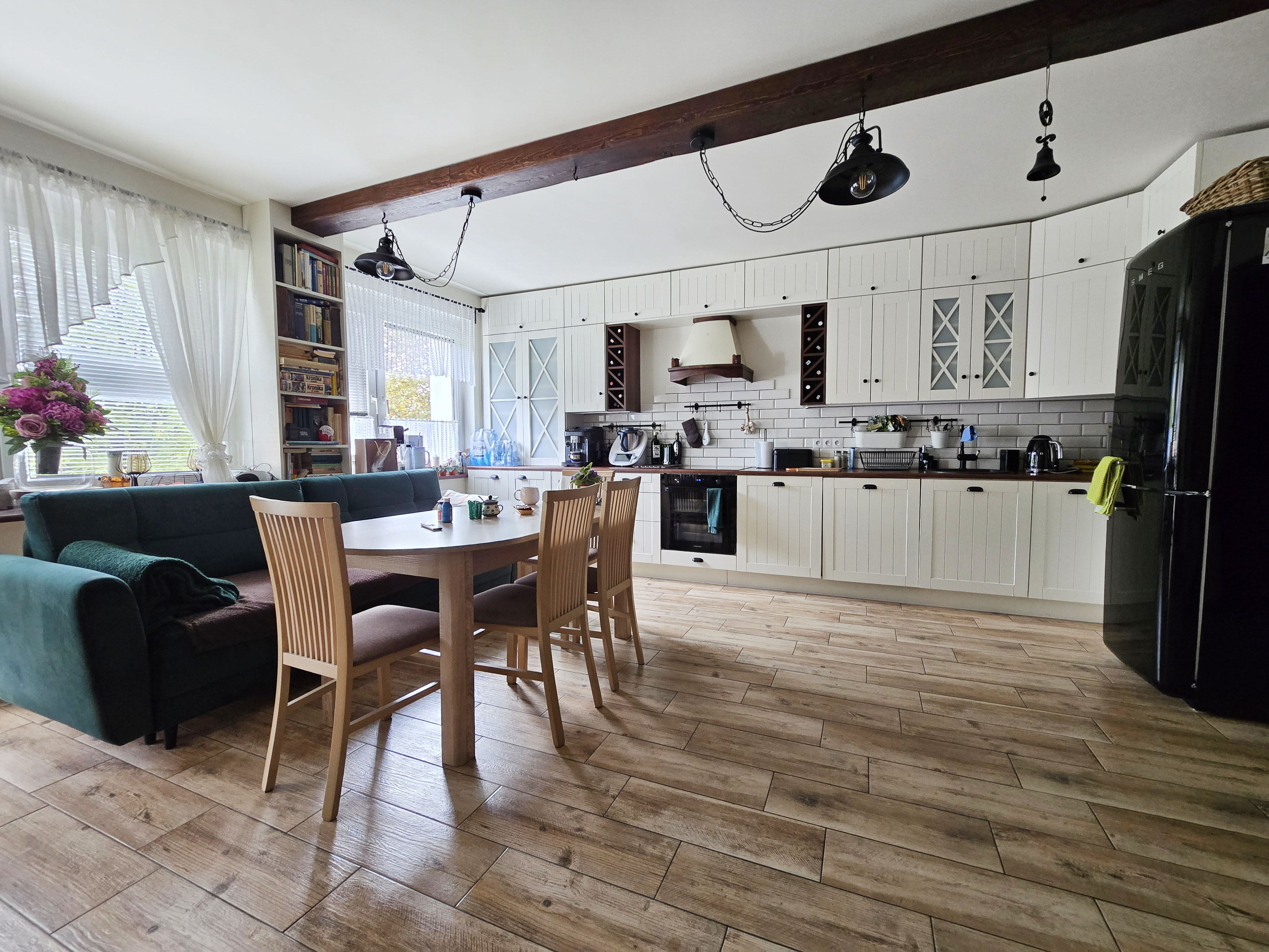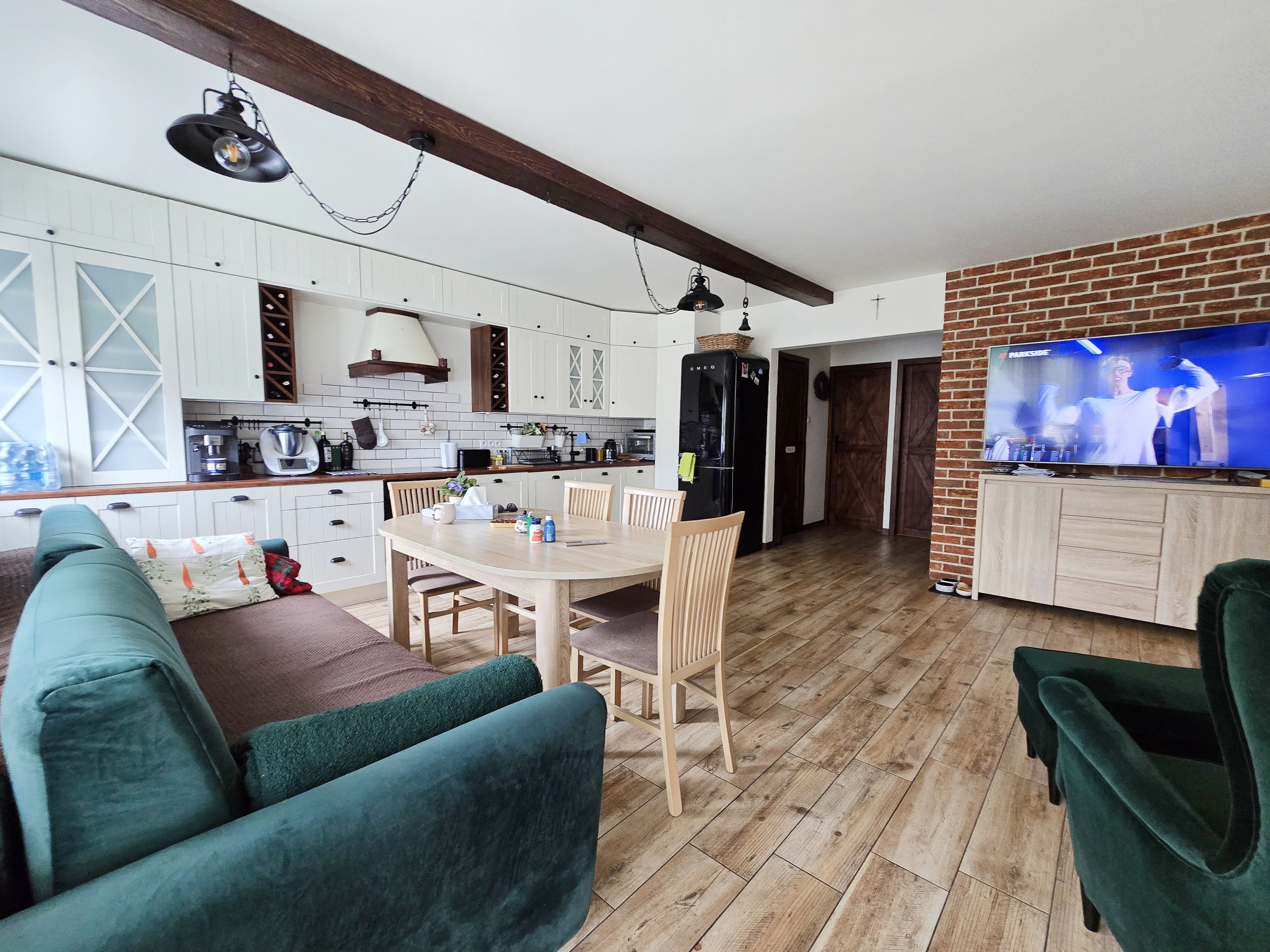 - Funkcjonalny układ – salon z kuchnią otwarty, co daje przestrzeń i komfort;